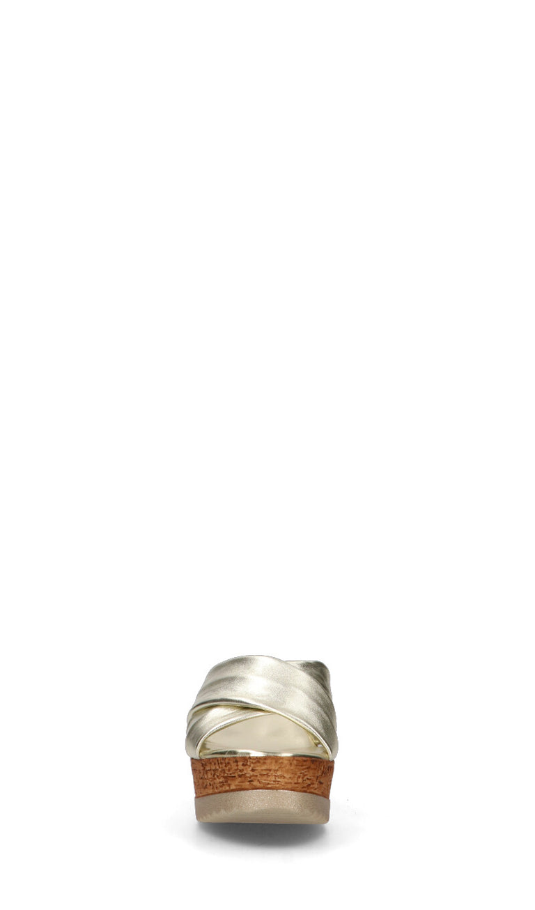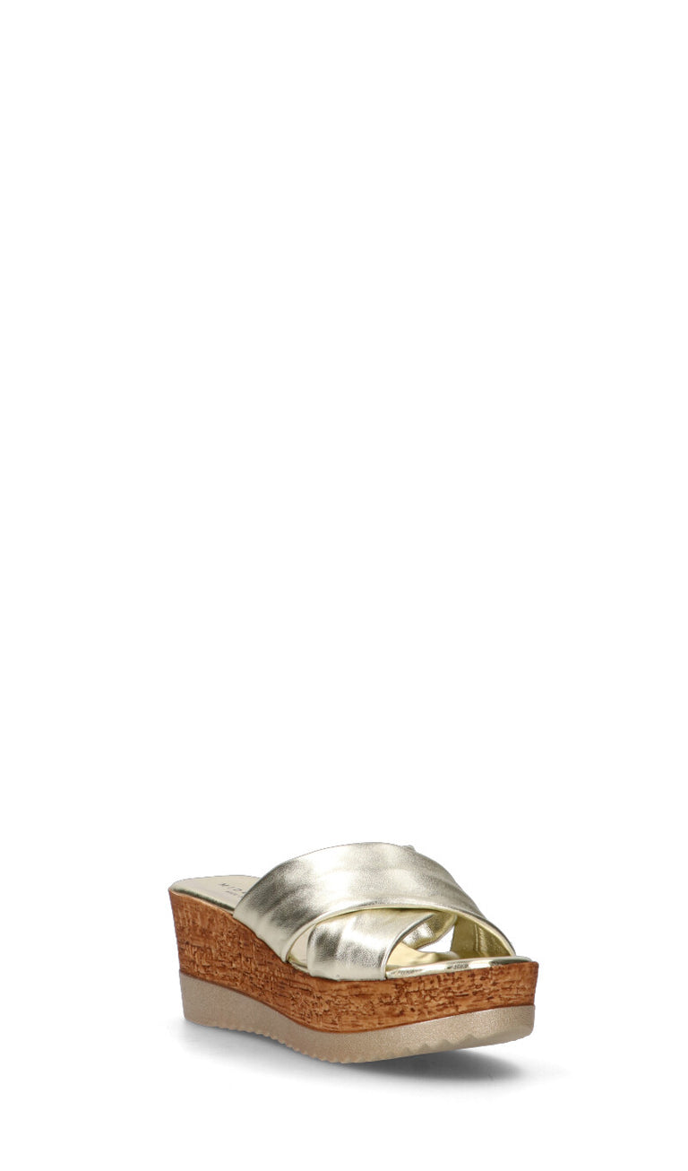 MIDELETTE Ciabatta donna oro in pelle. Ti innamorerai di queste comode e leggere ciabatte in pelle con zeppa alto 7 centimetri. Perfette per le tue estive passeggiate, ti faranno brillare con il loro splendido colore oro e ti regaleranno il massimo comfort per tutto il giorno. Non potrai più farne a meno!