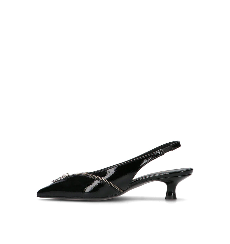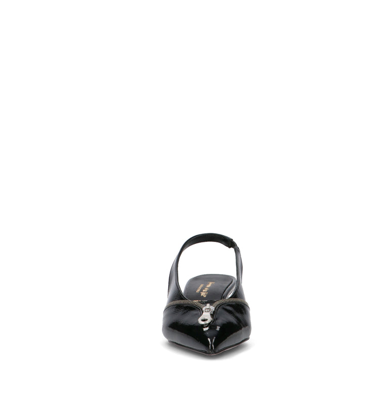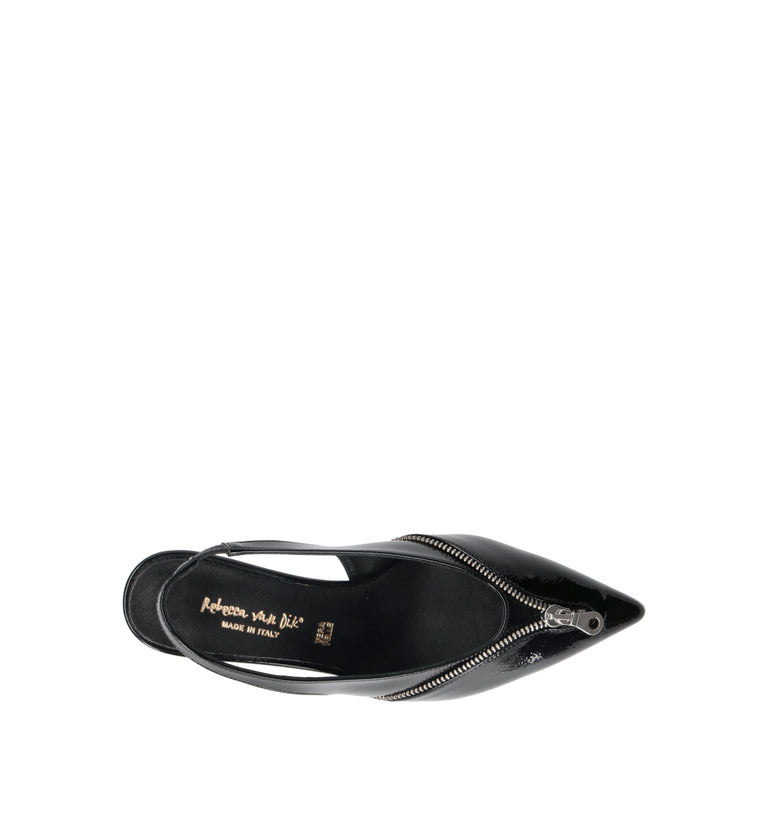 REBECCA VAN DIK Slingback donna nera in materiale sintetico effetto vernice. Finitura bordeaux lucida e zip decorativa sulla tomaia danno vita a un modello grintoso e femminile. Il tacco da 5 cm assicura comfort ed eleganza, perfetto per aggiungere un tocco originale a look da giorno o outfit serali.