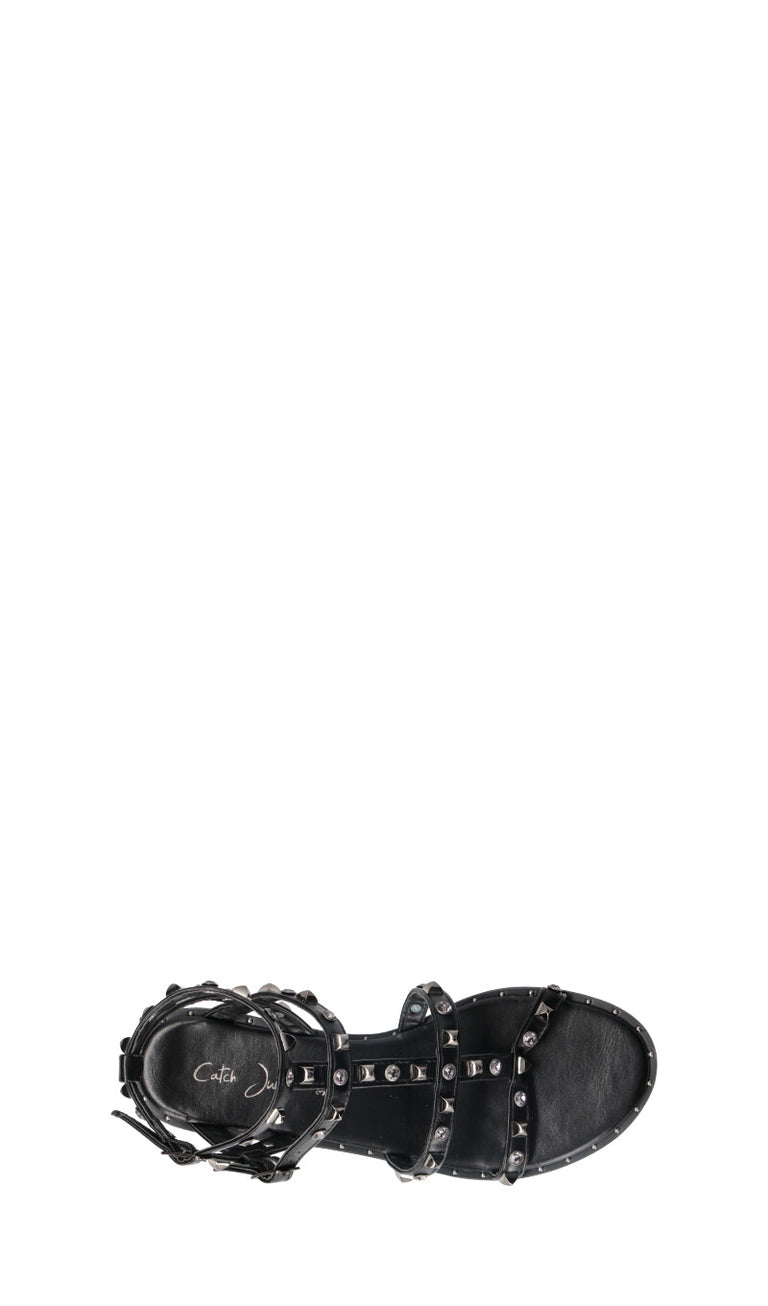 CATCH JUICE Sandalo donna oro nera in materiale sintetico. Questo sandalo flat da donna unisce comfort e stile, arricchito da borchie e strass decorativi che aggiungono una nota di luce e originalità. Perfetto per chi vuole un tocco di eleganza informale, si adatta facilmente a qualsiasi outfit, dalle giornate più casual alle serate estive.