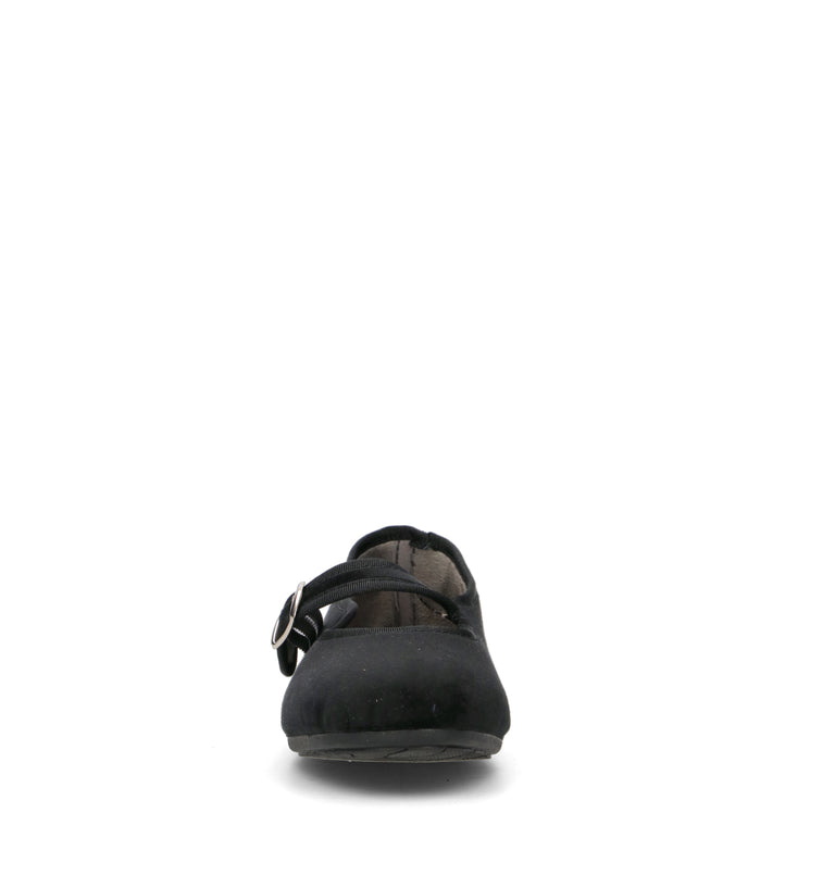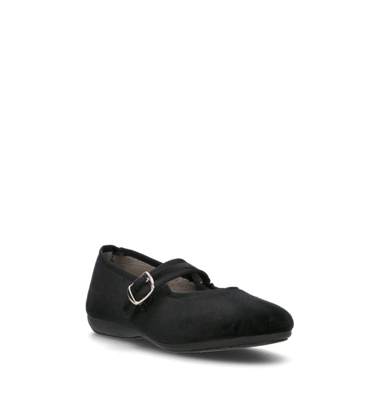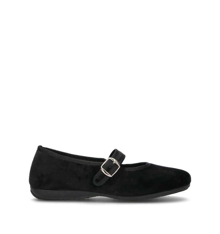 DOREA Pantofola donna nera in velluto. Il design classico è arricchito dal cinturino con fibbia laterale, che dona un tocco raffinato e assicura una calzata stabile. Il profilo in gros-grain tono su tono valorizza la linea affusolata, rendendola perfetta per look eleganti o per aggiungere un tocco ricercato agli outfit quotidiani.