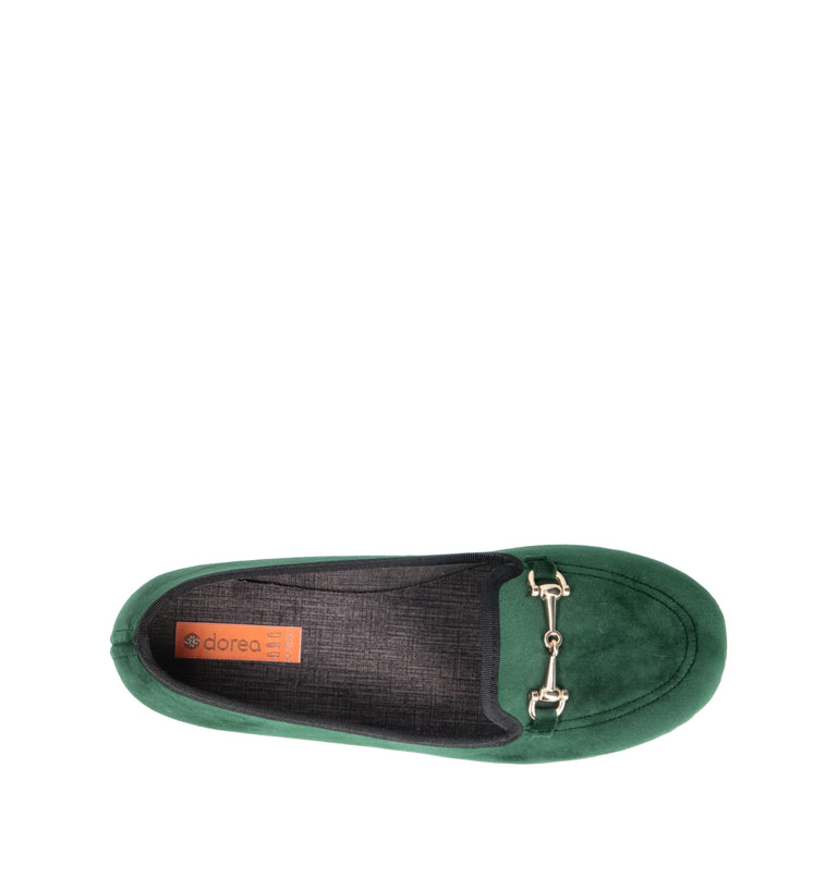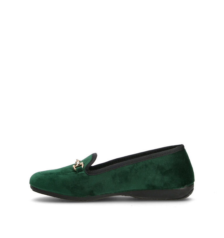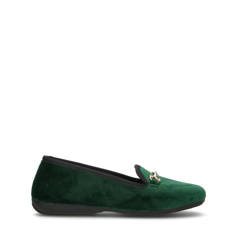 DOREA Pantofola donna verde in velluto. Il design raffinato si distingue per la tomaia in velluto liscio e il morsetto dorato a forma di cavallino, che aggiunge un tocco decorativo elegante. Il profilo in gros-grain nero incornicia la linea classica, mentre la suola flessibile garantisce comfort ideale per l’uso indoor quotidiano.