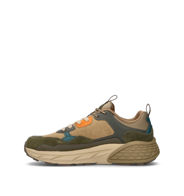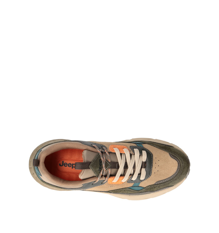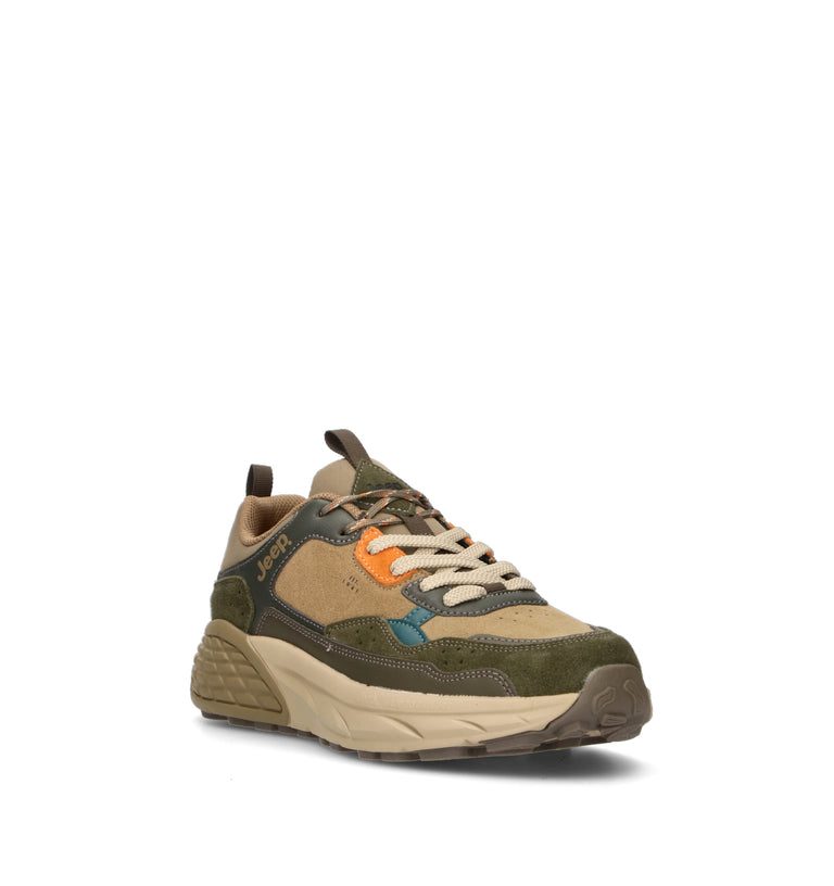 JEEP Sneaker uomo multicolor in pelle scamosciata e tessuto. Il design robusto combina inserti verdi, arancioni e azzurri in un mix cromatico energico e outdoor. La suola oversize con battistrada scolpito e supporto laterale rinforzato garantisce stabilità e comfort, mentre i tiranti su linguetta e tallone facilitano la calzata. Perfetta per un look dinamico e funzionale.