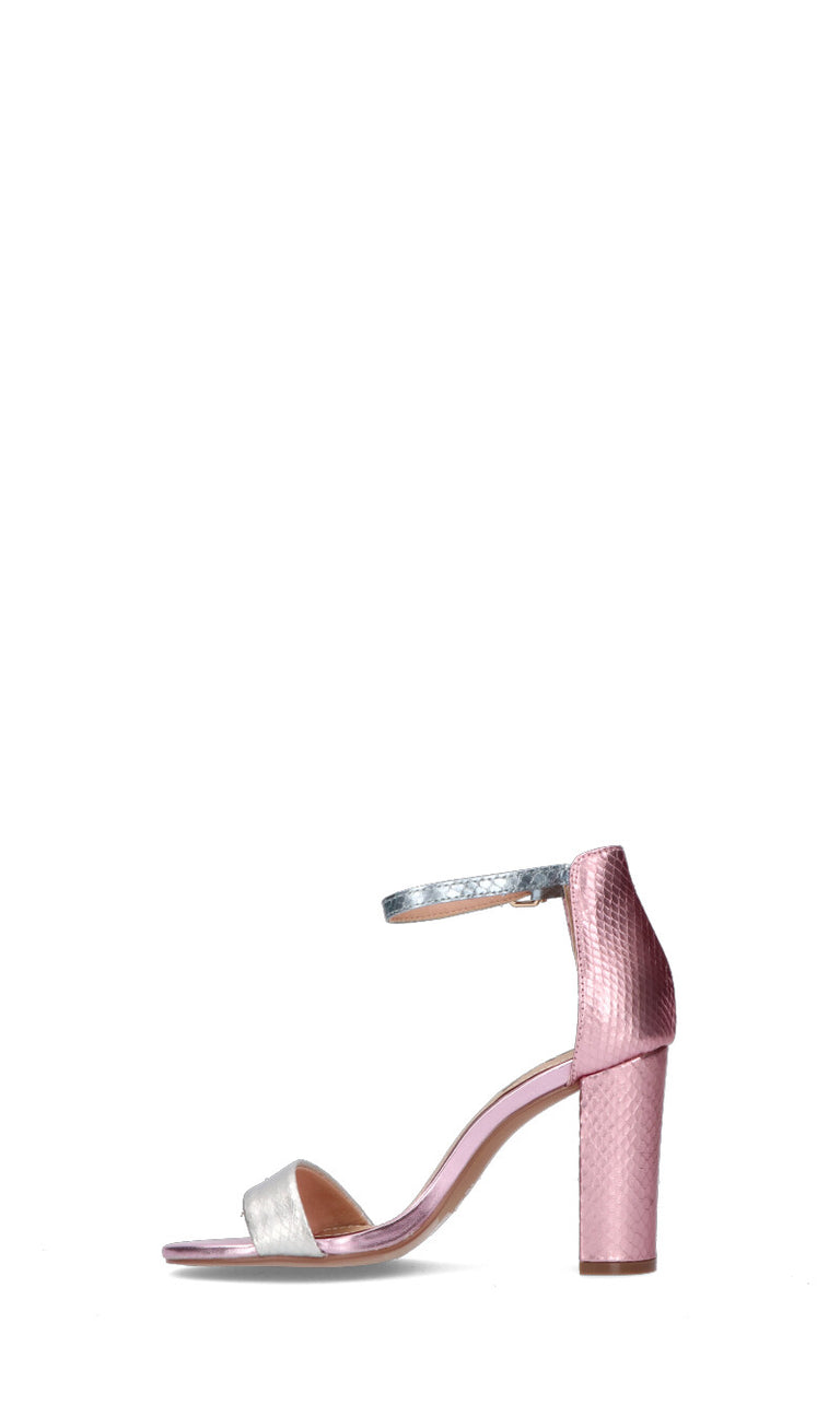 EXE Sandalo donna rosa e argento a trama pitonata. Il tacco largo di 9 cm e l'elegante cinturino alla caviglia rendono questo modello estremamente versatile, da abbinare ad ogni outfit e perfetto per slanciare la figura senza rinunciare al comfort del piede.